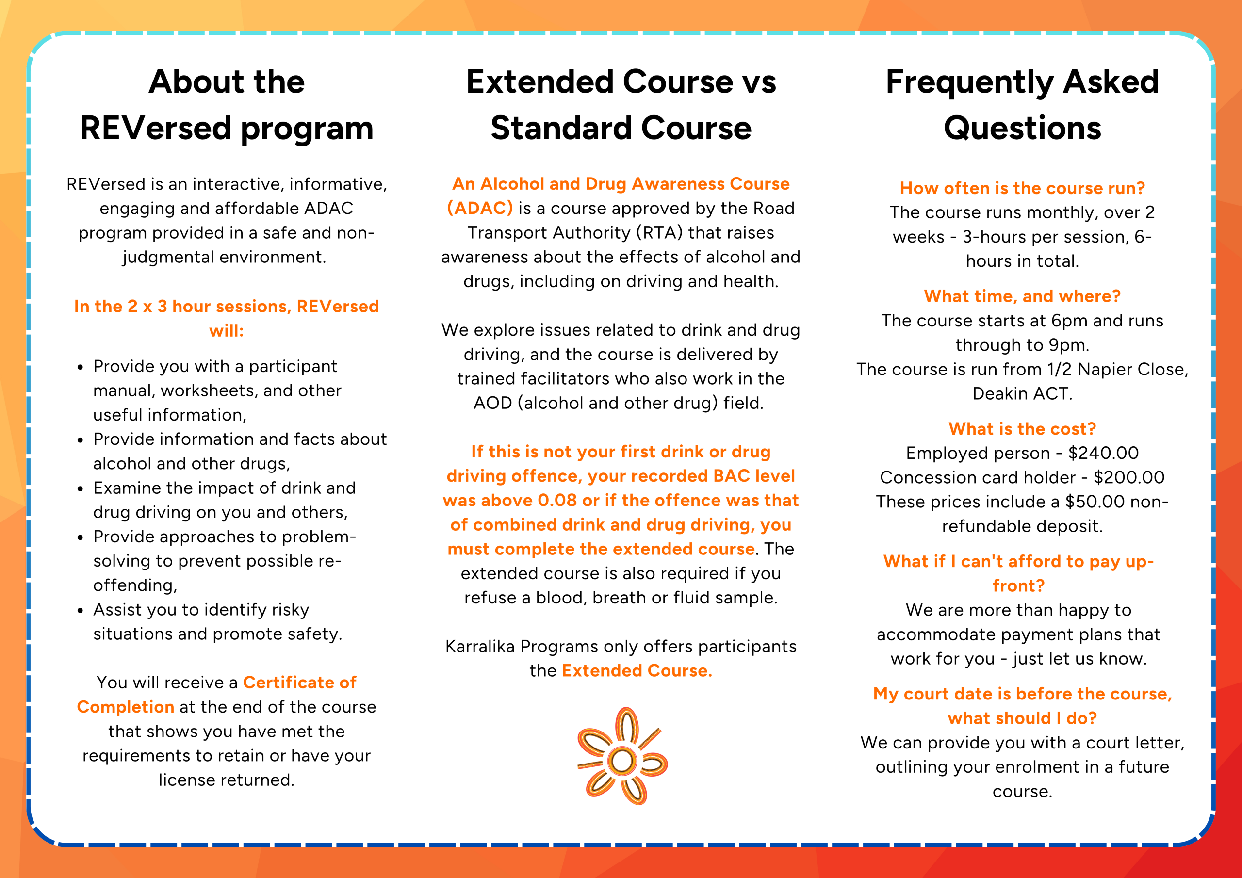 The program will provide you with information and facts about alcohol and other drugs; examine the impact of drink and drug driving behaviour on yourself and others; and provide difference approaches on ways to prevent re-offending.
